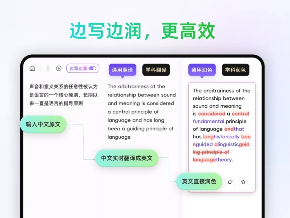 - 支持边写边译、边润的写作场景,让写作更加便捷顺畅